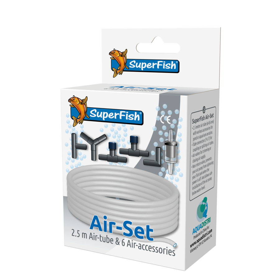 Complete Air-set with 2.5 meter air tube with tube connectors (Y-L-T), two air valves for trimming or closing air supply and a non-return valve for the safe installation of the pump below water level.