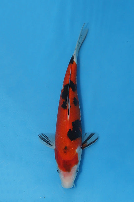 This striking Tosai Sanke  measures 27cm and boasts excellent pattern balance and vibrant colour separation. With a clean4white base (Shiroji), rich Hi (red) markings, and bold Sumi (black) developing in key areas, this young Koi already hints at great future potential.